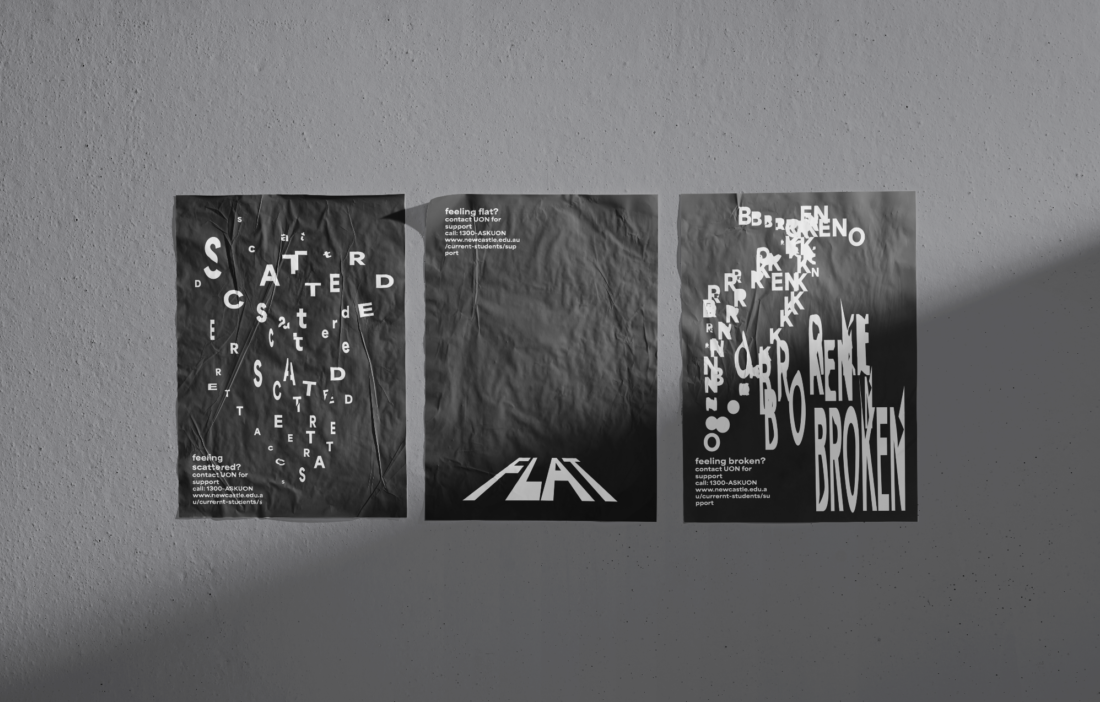 Young designer Dominic O'Brien created a series of posters focusing on the themes of mental health and raising awareness as it is something, "extremely important" to the designer. He specifically believed the university environment needs awareness and support for mental health illnesses and issues. O'Brien felt the medium of poster design, "is an accessible way to spread a message. It’s versatile in a way that it can be placed pretty much anywhere." The target audience is university students at UON (University of Newcastle) who may be feeling scattered, flat, broken or other emotions due to mental illnesses and are not sure what to do. O'Brien's posters provide information on where to reach out and contact information for support at UON.